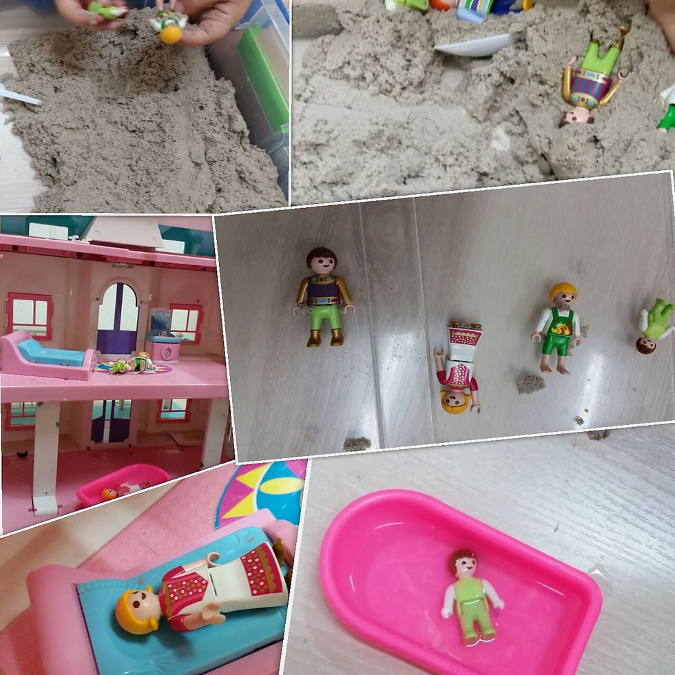 בפעילות אחת, עבדנו על כל כך הרבה דברים... משחק דמיוני, חשיפה לחומרים, מוטוריקה עדינה, התארגנות ועוד.. הבובות שלנו שיחקו מחבואים בתוך החול. וכשמצאנו אותן, הן היו כל כך מלוכלכות.. שהיינו חייבים לרחוץ אותן. אז הבאנו אמבטיות, מים וסבון ומגבות נייר קטנטנות. אחרי המקלחת, הבובות היו ממש עייפות, אז שלחנו אותן לישון בבית :)